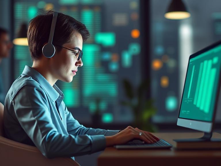 Alt text suggestion : Illustration futuriste d’un bureau connecté avec intelligence artificielle